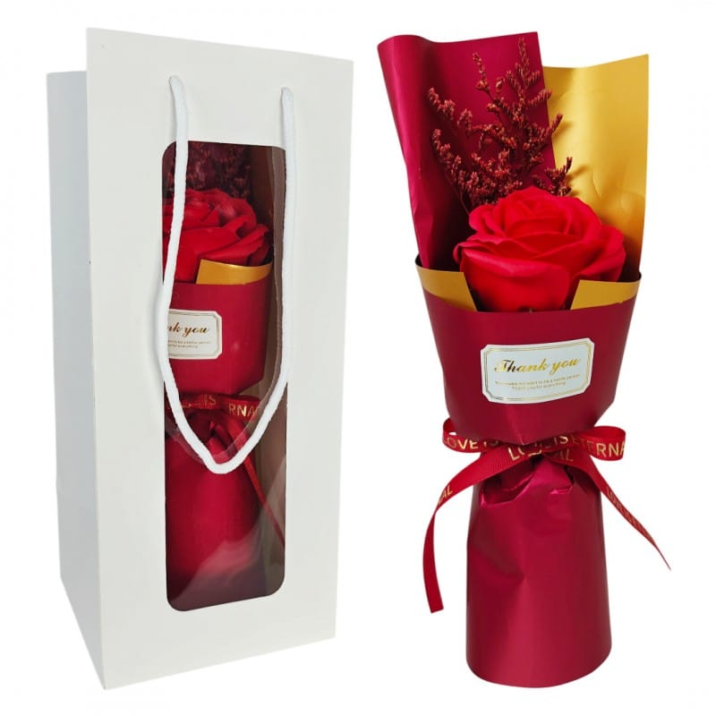 Bukiet z zapachową mydlaną różą w ozdobnym pudełkuSubtelny i wyjątkowy prezent dla kobiety, idealny na wiele okazji.Bukiet jest umieszczony w białym opakowaniu. Gotowy do wręczenia jako prezent dla Twojej ukochanej osoby.Każda róża mydlana jest starannie wykonana, aby oddać piękno prawdziwego kwiatu. Specyfikacja:Materiał: kwiaty mydlane/ kwiaty suszone.Materiał opakowania: tworzywo sztuczne Wymiary pudełka:28cm x 12cm x 12cmWymiary bukietu:28cm x 8cm x 5cmWaga:22g waga bukietu61g waga brutto