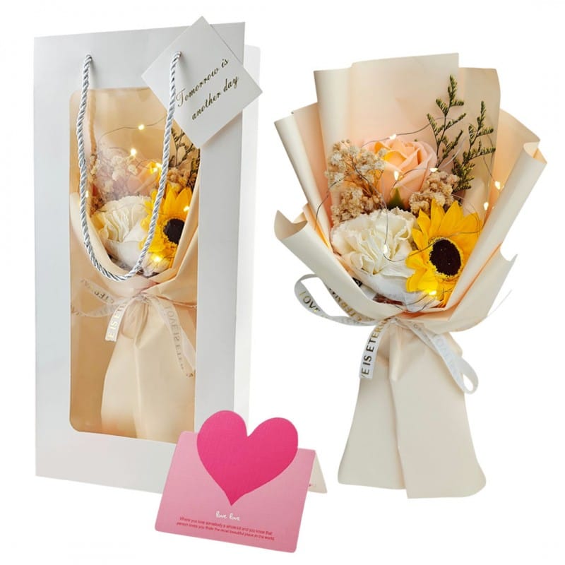 Bukiet kwiatów zapachowych kwiatów mydlanych w ozdobnym pudełkuSubtelny i wyjątkowy prezent dla kobiety, idealny na wiele okazji.Bukiet kwiatów mydlanych jest umieszczony w ekskluzywnym opakowaniu, ozdobionym subtelnymi zdobieniami i kokardą.Gotowy do wręczenia jako prezent dla Twojej ukochanej osoby.Każdy kwiat jest starannie wykonany, aby oddać piękno prawdziwego kwiatu. Specyfikacja:- Opakowanie z tworzywa sztucznego,- Wewnątrz światełka LED, 3 tryby świecenia, baterie w zestawie- Możliwość włączania i wyłączania lampek.Produkt do samodzielnego złożenia Materiał: kwiaty mydlane / opakowanie z tworzywa sztucznego. Wymiary:Wysokość: około 34,5 cmSzerokość bukietu: około 14 cm Wymiary pudełka:16,5 cm x 10 cm x 34,5 cmWaga bukietu:43gWaga produktu z pudełkiem: 110g