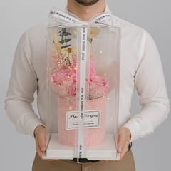 Bukiet kwiatów zapachowych kwiatów mydlanych w ozdobnym pudełkuSubtelny i wyjątkowy prezent dla kobiety, idealny na wiele okazji.Bukiet kwiatów mydlanych jest umieszczony w ekskluzywnym opakowaniu, ozdobionym subtelnymi zdobieniami i kokardą.Gotowy do wręczenia jako prezent dla Twojej ukochanej osoby.Każdy kwiat jest starannie wykonany, aby oddać piękno prawdziwego kwiatu. Specyfikacja:- Opakowanie z tworzywa sztucznego,- Wewnątrz światełka LED, baterie w zestawie- Możliwość włączania i wyłączania lampek. Materiał: kwiaty mydlane / opakowanie z tworzywa sztucznego. Wymiary:Wysokość: około 28 cmSzerokość bukietu: około 13 cm Wymiary pudełka:17cm x 17cm x 28cm Waga produktu z pudełkiem: 200g