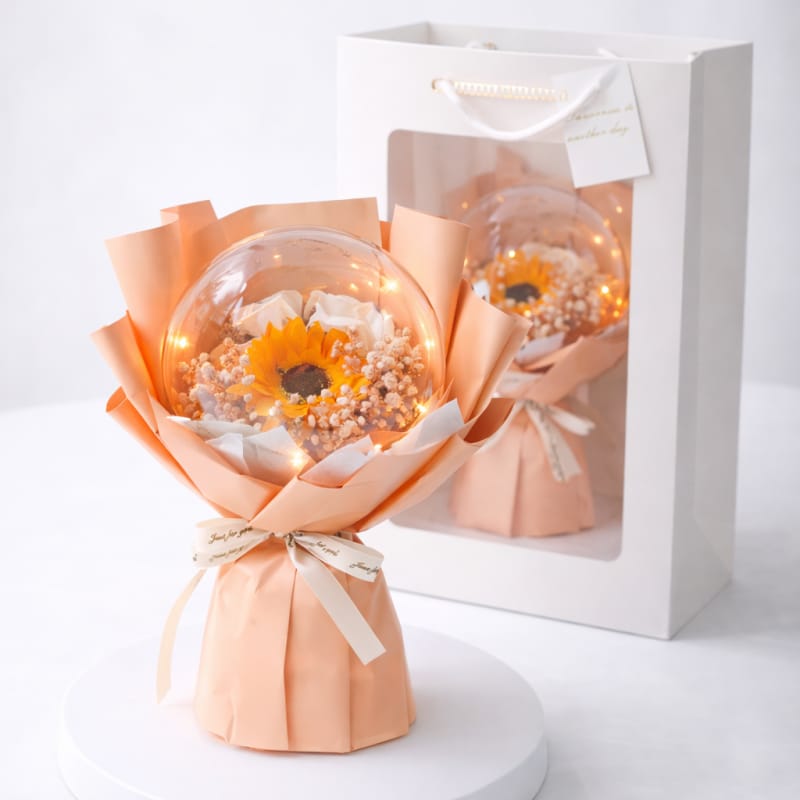 Bukiet kwiatów zapachowych kwiatów mydlanych w ozdobnej torebceSubtelny i wyjątkowy prezent dla kobiety, idealny na wiele okazji.Bukiet kwiatów mydlanych jest umieszczony w ekskluzywnym opakowaniu, ozdobionym subtelnymi zdobieniami i kokardą.Dodatkowo kwiaty zamknięte są w przezroczystej kuli, która dodatkowo chroni je przed uszkodzeniami.Gotowy do wręczenia jako prezent dla Twojej ukochanej osoby.Każdy kwiat jest starannie wykonany, aby oddać piękno prawdziwego kwiatu. Specyfikacja:- Opakowanie z tworzywa sztucznego,- Wewnątrz światełka LED, 3 tryby świecenia, baterie w zestawie- Możliwość włączania i wyłączania lampek.Produkt do samodzielnego złożenia Materiał: kwiaty mydlane / opakowanie z papieru i tworzywa sztucznego. Wymiary:Wysokość: około 30 cmSzerokość bukietu: około 21 cm Wymiary torebki:24 cm x 14 cm x 35 cm Waga bukietu:174g Waga produktu z opakowaniem: 257g