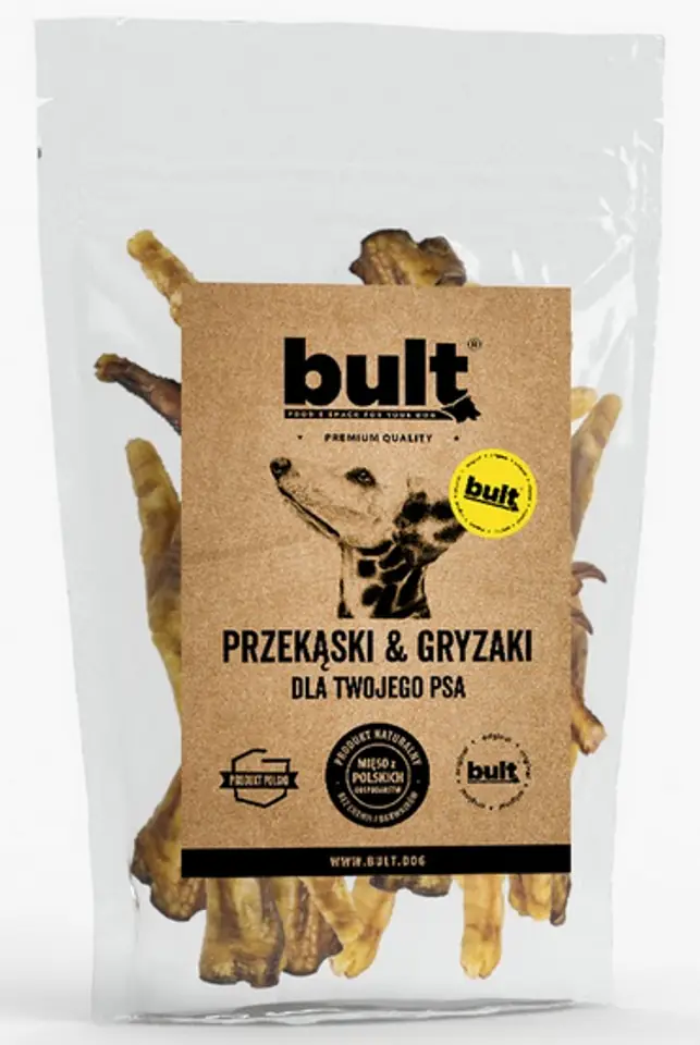 Indycze łapy duże marki BULT to wspaniały naturalny gryzak dla psów średnich i dużych ras. Będzie doskonałą alternatywą dla psów z alergią na mięso kurczaka. Korzystnie wpływa także na stan dziąseł, pomoże utrzymać higienę zębów oraz wzmocni mięśnie żuchwy.Indycza łapa to idealny przysmak po skończonym treningu lub spacerze. Chrupkie i aromatyczne, w pełni naturalne gryzaki z indyczych łap wspaniale radzą sobie z kamieniem nazębnym Twojego psa i wspomagają jego przemianę materii.Podczas spożywania nie pozostawiać psa bez nadzoru. Należy zapewnić dostęp do świeżej i czystej wody. Produkt nie jest przeznaczony do spożycia przez ludzi. Po otwarciu przechowywać w suchym i chłodnym miejscu.Skład:suszone indycze łapyAnaliza:białko surowe 40.5%, popiół surowy 37%, tłuszcz surowy 16.5%, wilgotność 6%Dawkowanie:Podawaj między posiłkami. Należy zapewnić psu stały dostęp do wody pitnej.