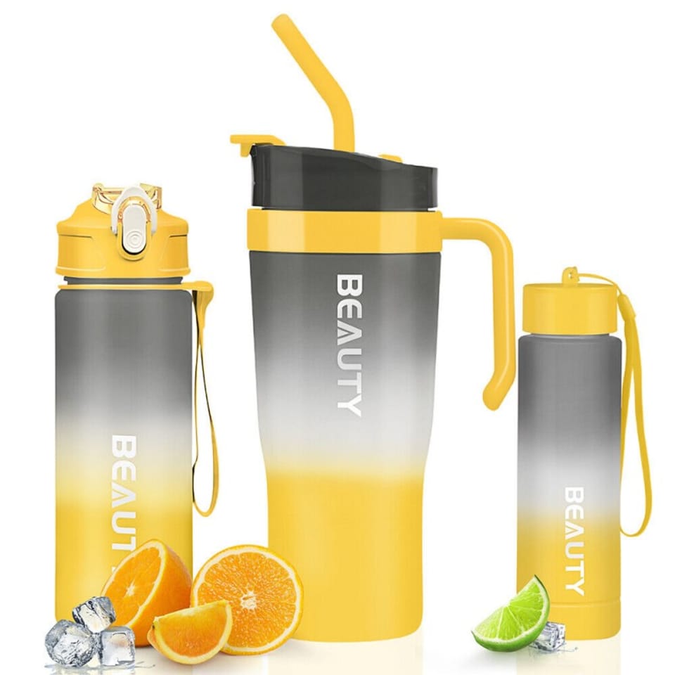 Butelka na wodę Bidon ombre 3w1 z miarką przenośny To świetne rozwiązanie dla osób aktywnych, uprawiających sport.Najmniejszy bidon 300 ml włóż do torebki, 800 ml weż na spacer lub rower a największy 1200ml na siłownię. Butelka jest wykonana z trwałego i bezpiecznego dla zdrowia plastiku, który jest odporny na uszkodzenia mechaniczne i nieprzepuszczalny dla zapachów.Dzięki temu możesz być pewien, że Twoja woda pozostanie świeża i smaczna przez długi czas. Bidon 1200ML: - ustnik ze słomką- posiada miarkę motywacyjną- unikatowe kolory- szeroki otwór ułatwiający mycie- praktyczna rączka- zamknięcie zabezpieczone przed przeciekaniem Wymiary 1200 ml: Średnica: 8 cmWysokość z zawleczką: 25 cm Pojemność: 1200ml Materiał: PPE Bidon 800 ML: - ustnik ze słomką- posiada miarkę motywacyjną- unikatowe kolory- szeroki otwór ułatwiający mycie- praktyczna rączkaWymiary 800ml: Średnica: 7 cmWysokość z zawleczką: 22 cm Pojemność : 800ml Zamknięcie zabezpieczone przed przeciekaniem Bidon 300 ML: - posiada miarkę motywacyjną- unikatowe kolory- szeroki otwór ułatwiający mycie- praktyczny uchwytWymiary 300ml: Średnica: 5 cmWysokość z zawleczką: 18 cm Pojemność: 300ml Materiał : PPE Zakrętka bez słomki Waga całego zestawu:355g Zestaw pakowany w woreczek foliowy. UWAGA ! Nie płukać we wrzątku, produkt nie jest odporny na bardzo wysokie temperatury i może się odkształcić.Myć i płukać w zwykłej ciepłej wodzie. Nie myć w zmywarce. Po użyciu butelkiumyj ręcznie butelkę ciepłą wodą i płynem do naczyńprzechowuj otwartą i dokładnie wysuszoną. Myciemyj ręcznienie gotujnie zamrażajnie używaj w kuchence mikrofalowejnie używaj ostrych myjek