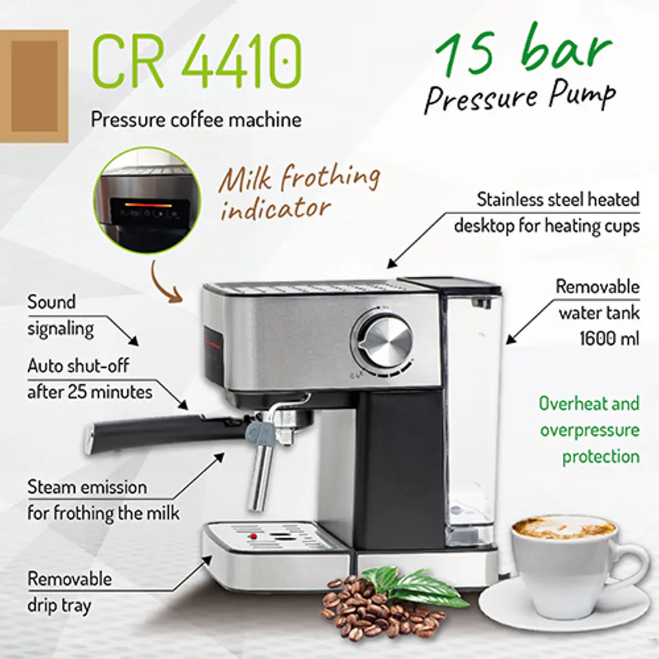 Camry Espresso and Cappuccino Coffee Machine CR 4410 Pump pressure 15 bar, Built-in milk frother, Drip, 850 W, Black/Stainless s