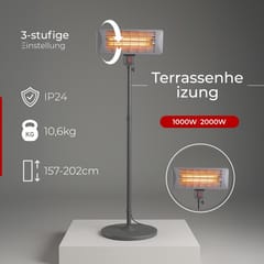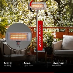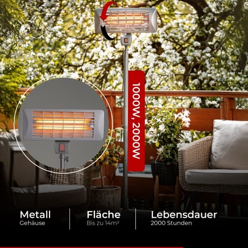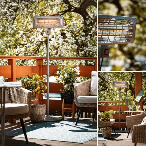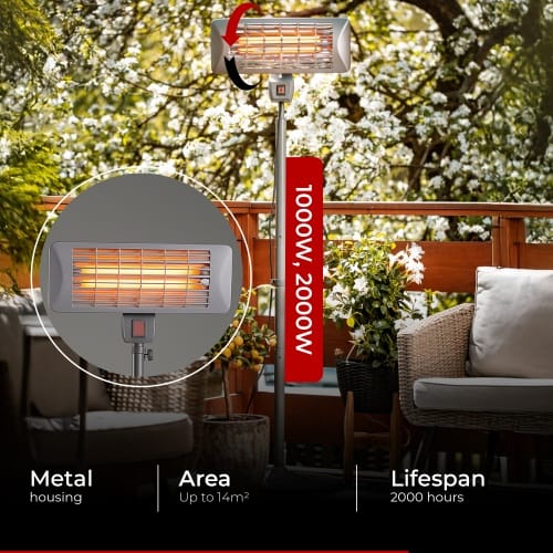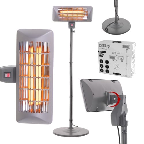 Ogrzewacz CR7737 został zaprojektowany do użytku na zadaszonych tarasach i patiach, nie służy do ogrzewania wewnątrz pomieszczeń. Łatwy w montażu, wszystkie potrzebne elementy montażowe znajdują się w opakowaniu. Ogrzewacz wyposażony jest w 2 stopnie grzania 1000W, 2000W oraz dwie grzałki kwarcowe, które skutecznie ogrzeją do 14m2. Dla komfortu użytkowników urządzenie wyposażono w 3 stopniową regulację kąta nachylenia głowicy oraz regulację wysokości w zakresie 157-202cm. Obudowa IP24 odporna jest na rozpryskiwanie się wody. Ciężka podstawa skutecznie stabilizuje konstrukcję, jednak gdyby urządzenie uległo przewróceniu to wyłączy się automatycznie dzięki wbudowanemu wyłącznikowi bezpieczeństwa. Estetyczne wykonanie, wygoda użytkowania, bez głośna praca, naturalna ciepła barwa żarzącej się grzałki to główne atuty produktu. Gumowe nóżki ochronią podłoże. Element grzejny jest prosty do wymiany, żywotność grzałki 2000 godzin, dostępna w sprzedaży pod symbolem GL7734.1.