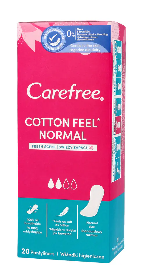 Poczuj się czysto i świeżo każdego dnia z wkładkami higienicznymi CAREFREE® with cotton extract. Te przewiewne wkładki zawierają naturalny ekstrakt z bawełny. Podczas noszenia są tak komfortowe jak bawełniana bielizna, więc możesz o nich zapomnieć i po prostu czuć się świeżo. Dostępne także w wersji zapachowej.