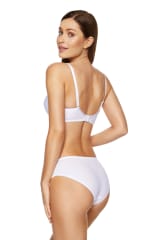 Klasyczny biustonosz typu push-up delikatnie modelujący i unoszący biust. Miseczki bezszwowe, formowane termicznie, obszyte jednolitą dzianiną gładką. Plecy wykonane z tej samej dzianiny.