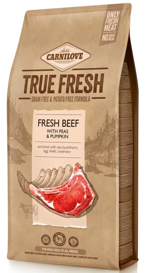 Carnilove True Fresh Beef Adult - wołowinaPełnoporcjowa karma dla psów.Receptura bez zbóż i ziemniaków, ze świeżym mięsem, dla psów dorosłych wszystkich ras. Świeża wołowina z groszkiem i dynią.Karma zawiera dużą ilość świeżej wołowiny z gospodarstw rolnych i lokalnych źródeł. Mięso pochodzi od zwierząt dopuszczonych do konsumpcji przez ludzi.