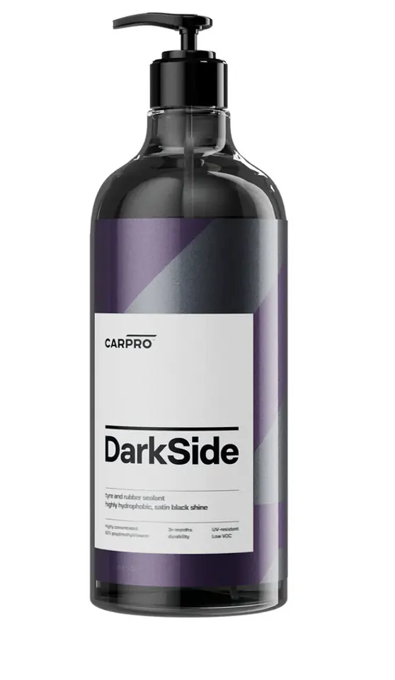 CarPro DarkSide – to silnie skoncentrowany dressing do opon i gumy. Formuła bazująca na 60% polidimetylosiloksanu pozwala na bardzo szybką i łatwą aplikację za pomocą dedykowanych aplikatorów do opon lub mikrofibry, pozostawiając piękny satynowy połysk. Produkt zapewnia dodatkowo świetnie właściwości samooczyszczania, hydrofobowe, a także ochronę przed promieniowaniem UV i chemikaliami.