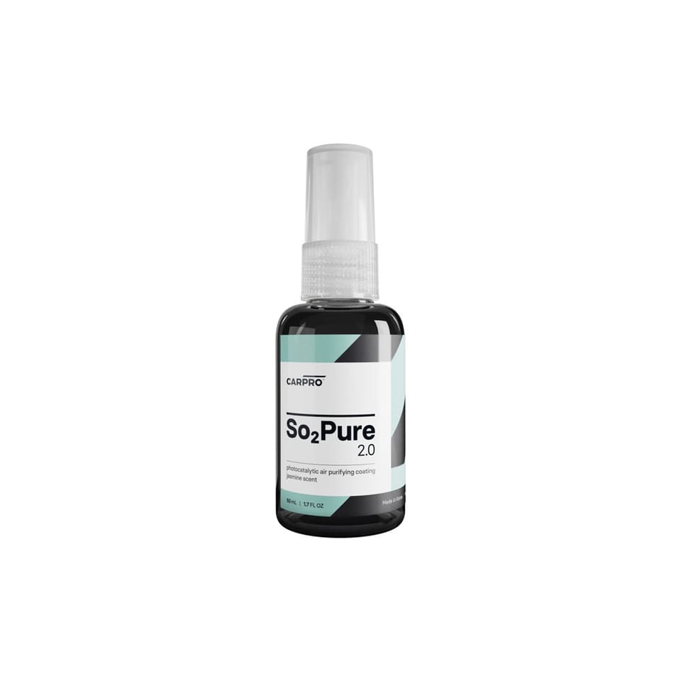 CarPro So2Pure 2.0 – to ewolucja fotokatalitycznej powłoki do usuwania nieprzyjemnych zapachów z wnętrza samochodu, która bazuje na najnowszej technologii TiO2. Aktywuje się pod wpływem światła i skutecznie eliminuje nawet najsilniejsze zapachy i zanieczyszczenia. Pozostawia przyjemny zapach jaśminu.