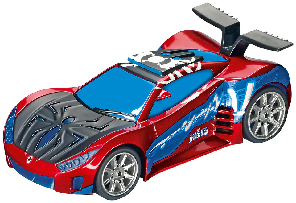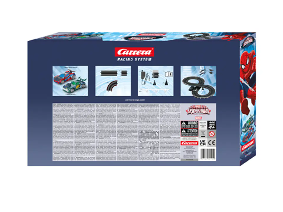 Nie ma ograniczeń dla młodych kierowców z Carrera GO!!! Zbuduj zestaw „Spider-Man” 2,4! W jego skład wchodzą auta przedstawiające bohaterów filmu „Ultimate Spiderman ‐ Goblin Getaway“. Zacznij szaloną jazdę w czerwono-niebieskim samochodzie Spider-Man za uciekającą zielono-żółtą wyścigówką przestępcy Goblina, poczuj się jak w filmie produkcji MARVEL. Czas udaremnić plany Goblina i ścigać się na torze CARRERA. Na prostych nie tylko padają rekordy prędkości, ale rozgrywają się także szalone pościgi obu zaciekłych rywali. Kto zwycięży?