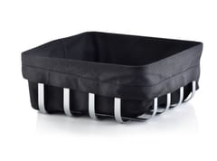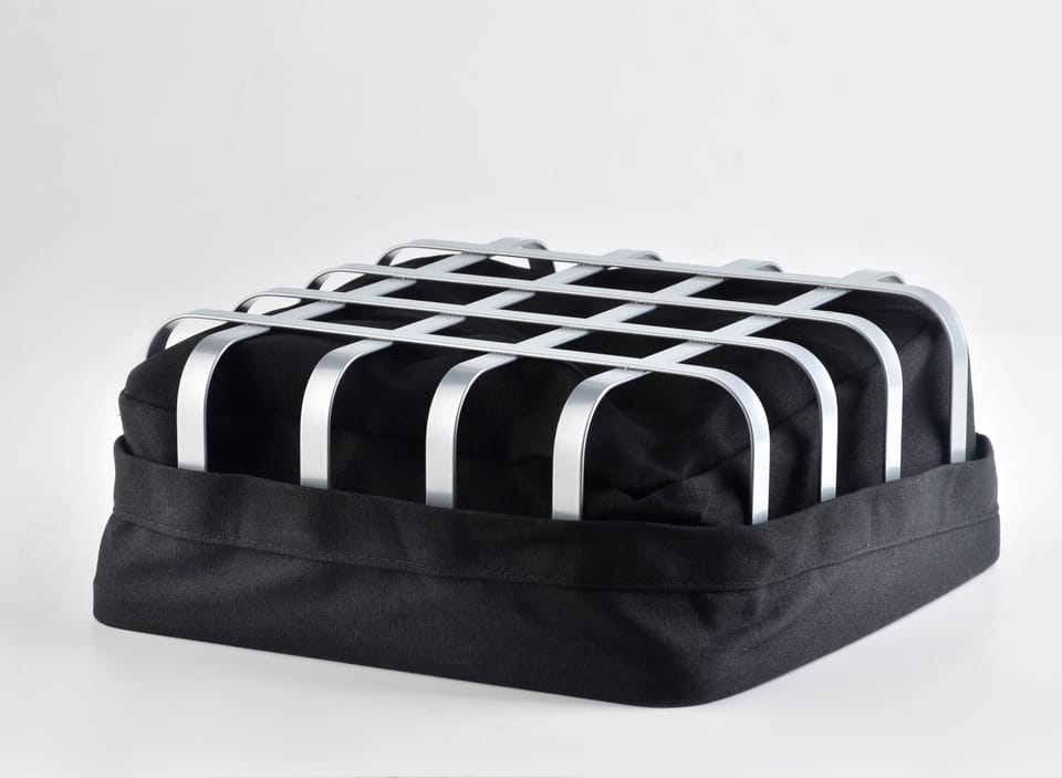 Kwadratowy metalowy srebrny Koszyk z serii CASSIE marki COOKINI. Wyścielany czarnym materiałem. Idealny na stół kuchenny do podawania pieczywa lub do przechowywania różnych drobiazgów. Koszyk:dł 22cm szer. 22cm h: 9cmopakowanie :folia