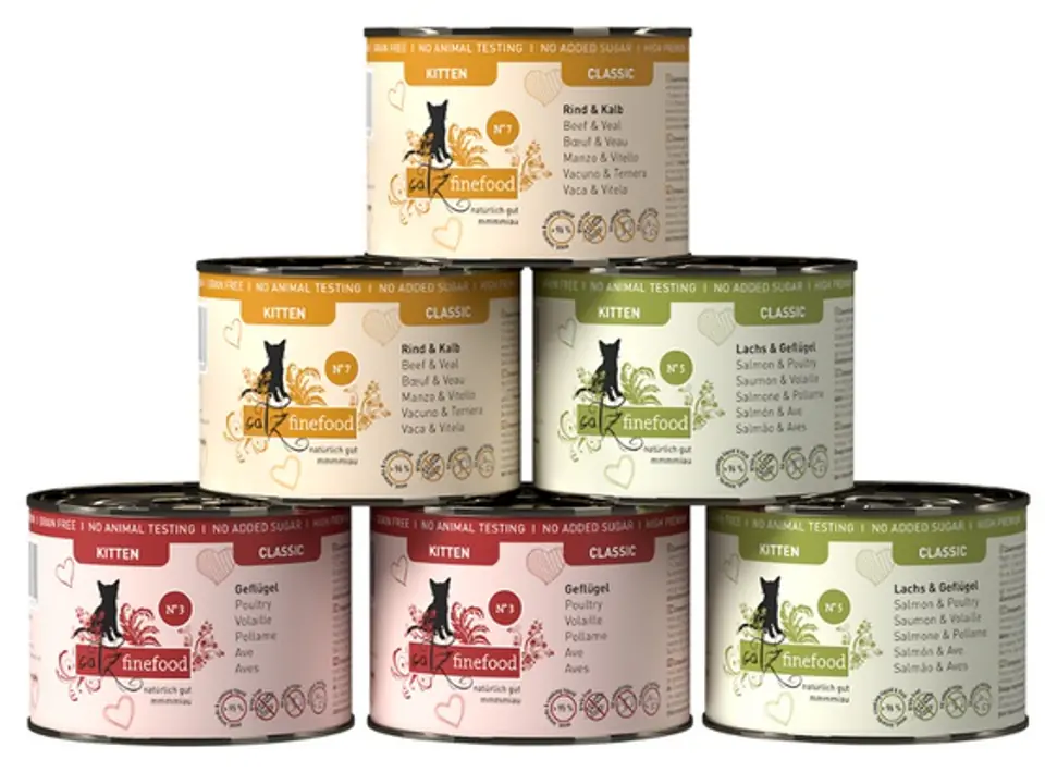 Dostosowaliśmy nasze popularne przepisy z Catz Finefood do potrzeb rosnących kotów. Dzięki bardzo podobnym podstawowym przepisom mała aksamitna łapka jest już zaznajomiona ze smakiem, który odnajduje ponownie jako dorosły kot w Catz Finefood.Catz Finefood Kitten zawiera dużo świeżego mięsa, podrobów i wywarów kuchennych, uzupełnionych o inne niezbędne składniki. Wszystkie odmiany zawierają skorupki jaj, które są naturalnym źródłem wapnia i przyczyniają się do prawidłowego funkcjonowania mięśni oraz do utrzymania zdrowych kości.Zalety Catz Finefood Classic Kitten są oczywiste: