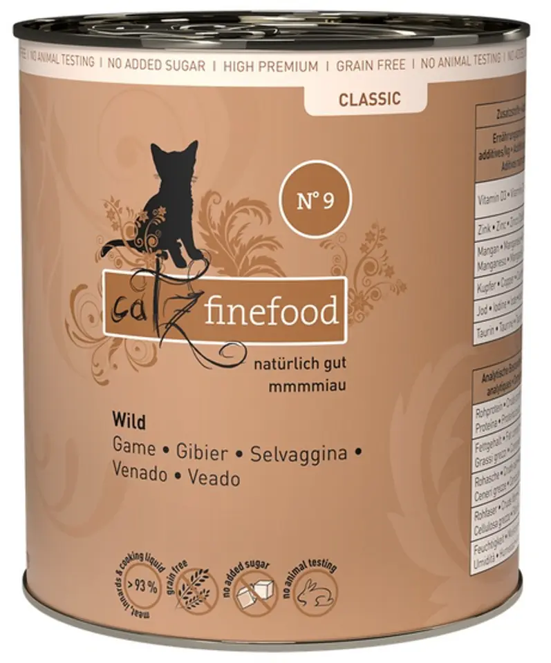 Specjał dla kotów – wartościowa karma dla naszych pupili. Catz finefood N°9 zawiera dużo delikatnej dziczyzny oraz zdrowe dodatki, jak borówka i ziemniak. Bez konserwantów, barwników i wzmacniaczy smaku. Nie zawiera GMO. Mmmmiau!Skład:dziczyzna 70% (w tym mięśnie, serca, wątroba), bulion z dziczyzny 23,6%, ziemniaki 3%, żurawina 2%, minerały 1%, rozmaryn 0,2%, olej z pestek dyni 0,2%Składniki analityczne:Białko surowe 10,5%, zawartość tłuszczu 6,5%, popiół surowy 2,5%, włókno surowe 0,4%, wilgotność 77%Dodatki dietetyczne na kg: Witamina D3 200 IU, tauryna 1500 mg, cynk 25 mg, mangan 1,4 mg, miedź 0,5 mg, jod 0,75 mgZalecana dzienna ilość/zapotrzebowanie:Dzienna porcja powinna wynosić ok. 3-5% masy ciała.