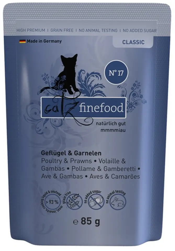 Specjał dla kotów – wartościowa karma dla naszych pupili. Catz finefood N°17 zawiera dużo delikatnego drobiu, krewetek oraz wartościowe dodatki, jak żurawina i algi morskie. Bez konserwantów, barwników i wzmacniaczy smaku. Nie zawiera GMO. Mmmmiau!Skład:drób 50% (w tym mięso, serca, żołądek, wątroba, szyja), bulion z drobiu i krewetek 23,6%, krewetki 20%, marchew 3%, żurawina 2%, minerały 1%, algi morskie 0,2%, olej z orzechów makadamia 0,2%Składniki analityczne:białko surowe 10,2%, zawartość tłuszczu 5,2%, popiół surowy 2,8%, włókno surowe 0,4%, wilgotność 80%Dodatki dietetyczne na kg: witamina D3 200 IU, tauryna 1500 mg, cynk 25 mg, mangan 1,4 mg, miedź 1 mg, jod 0,75 mgZalecana dzienna ilość/zapotrzebowanie: Dzienna dawka powinna wynosić około 3-5% masy ciała.
