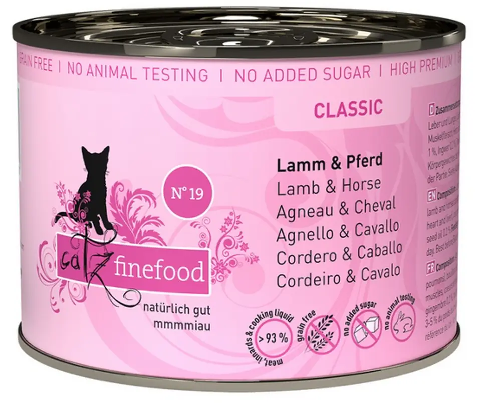 Specjał dla kotów – wartościowa karma dla naszych pupili. Catz finefood N°19 zawiera dużo delikatnej jagnięciny, koniny oraz wartościowe dodatki, jak pomidory i imbir. Bez konserwantów, barwników i wzmacniaczy smaku. Nie zawiera GMO. Mmmmiau!Skład:jagnięcina 50% (w tym serce, mięso, wątroba, płuco), bulion z jagnięciny i koniny 23,6%, konina 20% (w tym mięśnie, serce, wątroba), cukinia 3%, pomidor 2%, minerały 1%, imbir 0,2%, olej z pestek winogron 0,2%Składniki analityczne:białko surowe 10,6%, zawartość tłuszczu 7,2%, popiół surowy 2,8%, włókno surowe 0,4%, wilgotność 76%Dodatki dietetyczne na kg: witamina D3 200 I.E., tauryna 1500 mg, cynk 25 mg, mangan 1,4 mg, jod 0,75 mgZalecana dzienna ilość/zapotrzebowanie:Dzienna porcja powinna wynosić ok. 3-5% masy ciała.