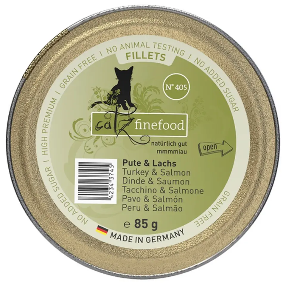Filet w delikatnej galarecie. Naturalne składniki i najlepsze mięso z filetów zapewniają doskonałą akceptację, nawet u wybrednych kotów.Wielu domowych tygrysów i poszukiwaczy przygód uwielbia smakołyki, ale większość dostępnych pokarmów dla kotów tego typu to wyłącznie produkty uzupełniające. Nasze filety w galarecie to karma pełnoporcjowa!Catz Finefood Filety w galaretce to zbilansowana, kompletna karma, która dostarcza Twojemu kotowi wszystkich składników odżywczych. Z tego powodu nadaje się do stałego codziennego karmienia.Nawet wrażliwe koty mogą delektować się doskonałymi filetami Catz w galarecie: przepis nie zawiera ziaren ani ryżu.Skład:Filet z indyka 40%, bulion 38,6%, łosoś 10%, wątroba z indyka 5%, tłuszcz kurczaka 5%, minerały 1%, nasiona Chia 0,2%, olej z łososia 0,2%Składniki analityczne:białko 14,9%, tłuszcz 5,6%, popiół surowy 3%, włókno surowe 0,4%, wilgotność 74%Dodatki na 1 kg:Witamina D3 200 j.m., tauryna 1500 mg, cynk 25 mg, mangan 1,4 mg, miedź 2 mg, jod 0,75 mgZalecana dzienna ilość/zapotrzebowanie:Dzienna porcja powinna wynosić ok. 3-5% masy ciała.