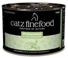 Skład:Dzik 70% (w tym mięso mięśniowe 15%, serce i wątroba), wywar z dzika 28,8%, minerały 1%, olej z wiesiołka 0,2%.Składniki analityczne:Wilgotność 77%, białko surowe 10,5%, zawartość tłuszczu 6,2%, popiół surowy 2,8%, włókno surowe 0,4%Dodatki dietetyczne na 1 kg:Witamina D3 200 I.E., tauryna 1500 mg, cynk 25 mg, mangan 1,4 mg, miedź 0,5 mg, jod 0,75 mgZalecana dzienna ilość/zapotrzebowanie:Dzienna porcja powinna wynosić 3,2-5,7% masy ciała.
