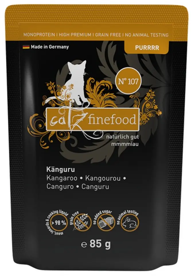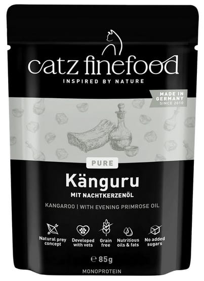 Skład:Kangur 70% (mięso mięśniowe 5%), bulion z kangura 28,8%, minerały 1%, olej z wiesiołka 0,2%Składniki analityczne:Wilgotność 79%, białko surowe 11,5%, zawartość tłuszczu 3,5%, popiół surowy 2,6%, włókno surowe 0,4%Dodatki dietetyczne na kg:Witamina D3 200 I.E., tauryna 1500 mg, cynk 25 mg, mangan 1,4 mg, jod 0,75 mgZalecana dzienna ilość/zapotrzebowanie:Dzienna porcja powinna wynosić ok. 3-5% masy ciała.