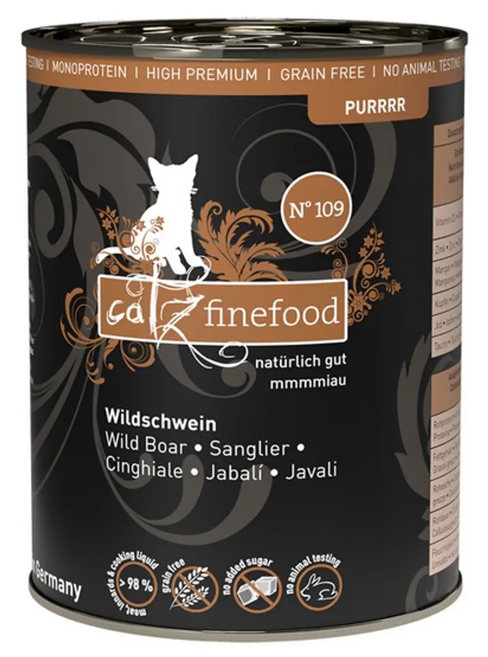 Skład:Dzik 70%, bulion z dziczyzny 28,8%, minerały 1%, olej z pestek winogron 0,2%Składniki analityczne:Wilgotność 77%, białko surowe 10,5%, zawartość tłuszczu 6,5%, popiół surowy 2,8%, włókno surowe 0,4%Dodatki dietetyczne na 1 kg:Witamina D3 200 I.E., tauryna 1500 mg, cynk 25 mg, mangan 1,4 mg, miedź 0,5 mg, jod 0,75 mgZalecana dzienna ilość/zapotrzebowanie:Dzienna porcja powinna wynosić 3-5% masy ciała.