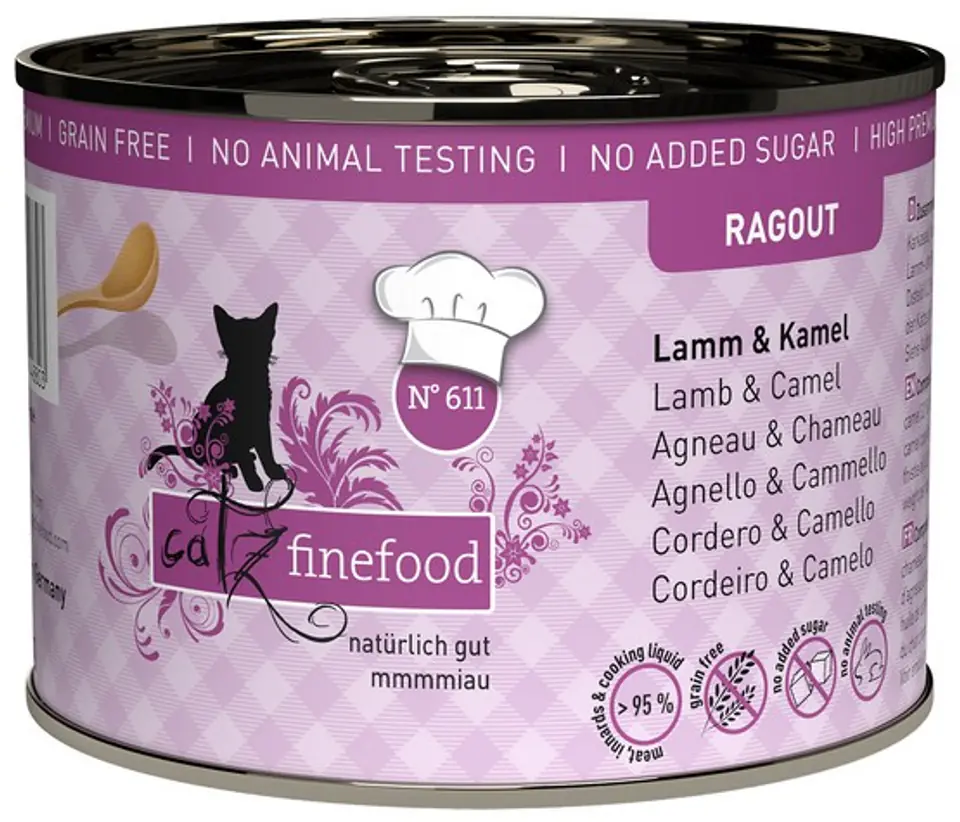 Catz Finefood Ragout N.611 - Jagnięcina i wielbłąd z marchewką i szpinakiemDelikatne kawałki, wyselekcjonowane naturalne mięso w postaci odpowiedniej wielkości kąsków w pysznym sosie.Specjalne składniki, takie jak wielbłąd, dzika kaczka, omułek i kangur zapewniają wyjątkowe doznania smakowe.Jak zwykle nie używamy sztucznych dodatków, dodatku cukru, wzmacniaczy smaku ani zbóż.Skład:Jagnięcina 36% (serce, wątroba, czerwone mięso i tusza), wielbłąd 32% (płuca, czerwone mięso, serce, nerki i wątroba), bulion z jagnięciny i wielbłąda 27,2%, marchew 3,5%, szpinak 0,5%, minerały 0,5%, olejek z ostu 0,2%, rumianek 0,1%Składniki analityczne:wilgotność 78,5%, białko surowe 10%, zawartość tłuszczu 4%, popiół surowy 2%, włókno surowe 0,6%Dodatki dietetyczne na kg:Witamina D3 200 I.E., cynk 20 mg, jod 0,75 mg, tauryna 1500 mgZalecana dzienna ilość/zapotrzebowanie: