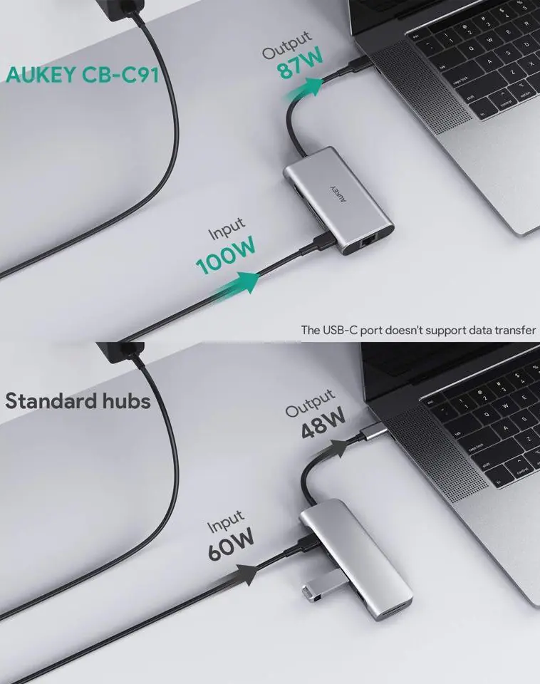 Aukey CB-C91 zapewnia prędkość przesyłania danych na poziomie 5 Gb/s, a dzięki HDMI wysyłanie rozdzielczości do 4K @ 30Hz na podłączony wyświetlacz nie będzie stanowiło żadnego problemu. Oprócz tego Port Gigabit Ethernet obsłuży prędkości sieci do nawet 1000 Mbps. Bez kłopotu naładujesz również ulubione urządzenia. Dzięki wykorzystaniu technologii Power Delivery Twój laptop może być zasilany mocą 100 W, nawet kiedy będziesz korzystać z innych funkcji koncentratora. Ładowanie jeszcze nigdy nie było tak szybkie z pewnością przyzwyczaisz się do tak wysokiego standardu pracy od pierwszego dnia, a Aukey CB-C91 stanie się dla Ciebie nieocenionym (i niezastąpionym!) wsparciem.