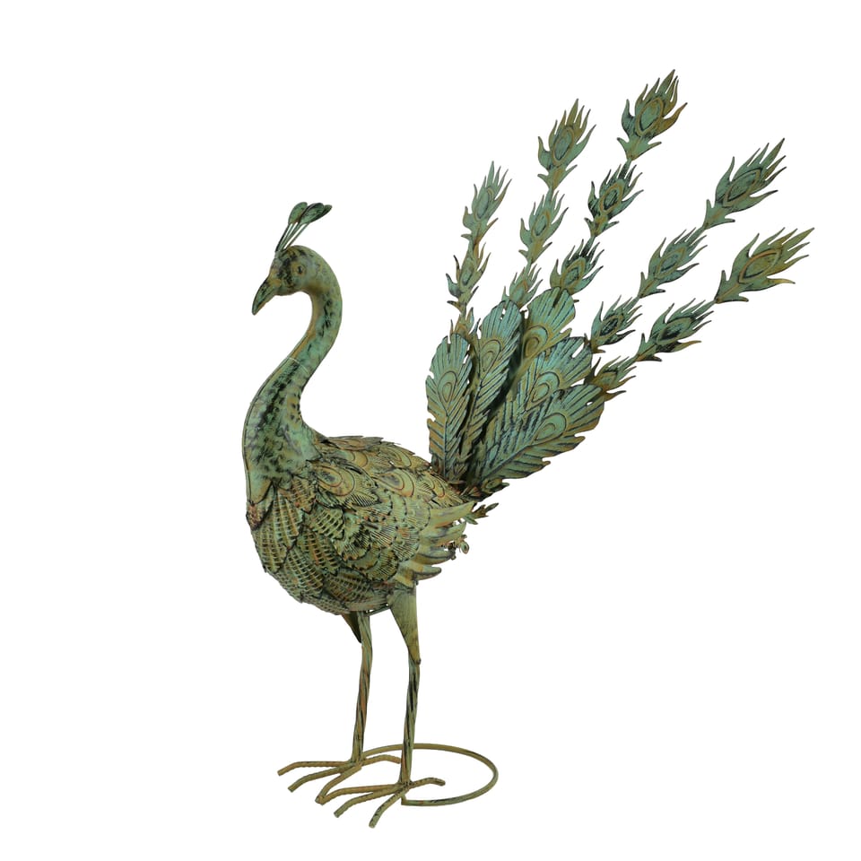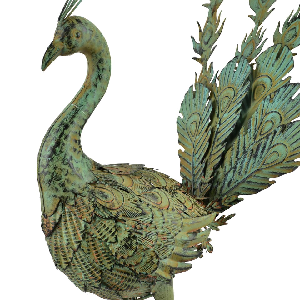 CEDRIC. Metalowa Figura PAW 583953 cm (pióra do góry)Dekoracyjna metalowa figura pawia marki CEDRIC to efektowny akcent, który wnosi do przestrzeni ogrodowej elegancję i wyrazisty charakter. Paw z uniesionymi piórami prezentuje się niezwykle dynamicznie i dekoracyjnie, symbolizując piękno, dumę i harmonię natury.Figura została wykonana z metalu i utrzymana w zielonej kolorystyce, dzięki czemu doskonale komponuje się z roślinnością ogrodu, tarasu czy balkonu. Starannie opracowane detale piór nadają dekoracji lekkości oraz artystycznego wyrazu, czyniąc ją atrakcyjną ozdobą przestrzeni zewnętrznych, jak i zadaszonych wnętrz.Dzięki wymiarom 583953 cm paw jest dobrze widoczny, a jednocześnie nie przytłacza aranżacji. Idealnie sprawdzi się jako dekoracja ogrodu lub tarasu, ustawiona wśród zieleni lub jako centralny element kompozycji. Wskazówka użytkowa: Aby zachować estetyczny wygląd figury na dłużej, nie zaleca się pozostawiania pawia na zewnątrz w okresie zimowym. Na czas mrozów najlepiej przenieść dekorację do suchego, zadaszonego miejsca.CEDRIC PAW to połączenie metalowej trwałości, naturalnej kolorystyki i dekoracyjnej formy, które podkreśli charakter każdej przestrzeni wypoczynkowej.