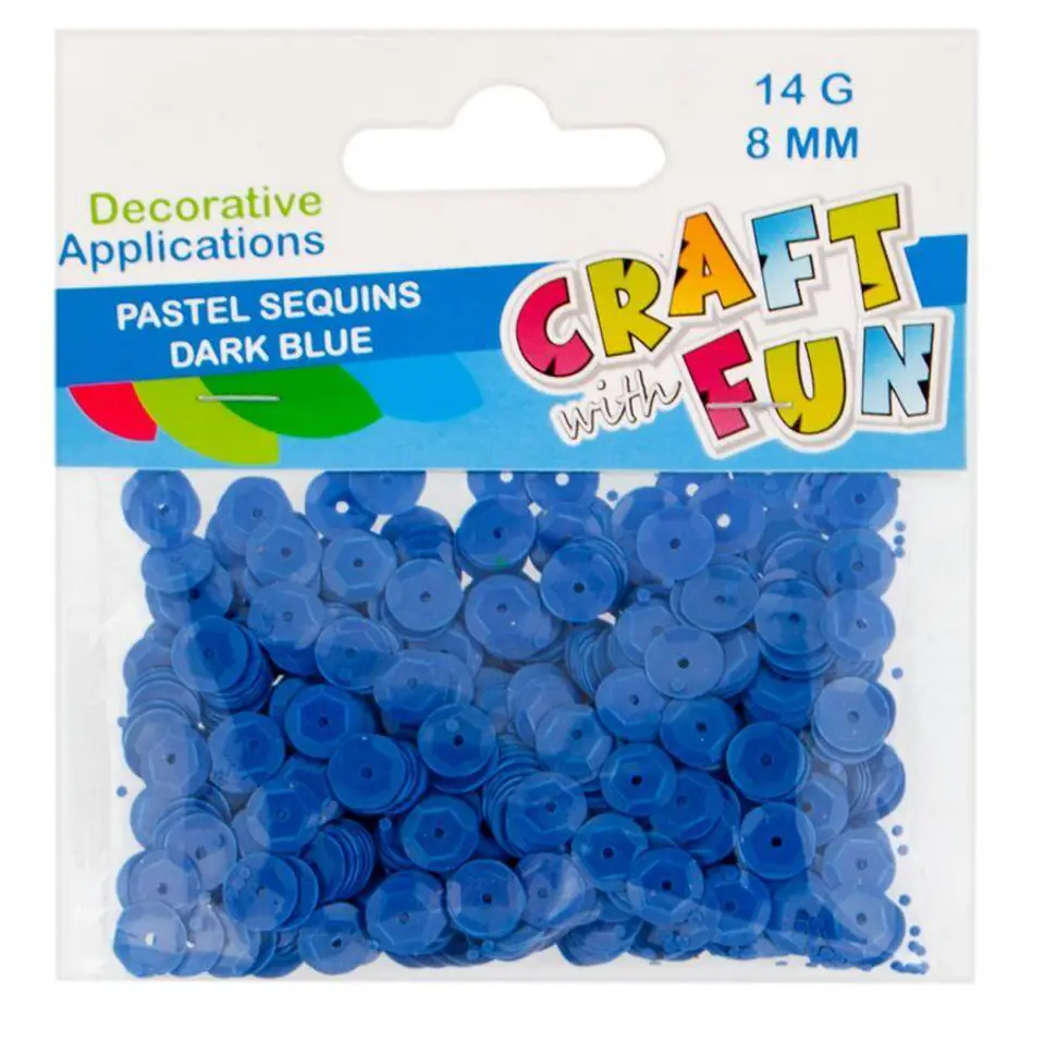 Zalety produktów: można zaprojektować własne ozdoby lub dekoracje, idealne do wykonywania wszelkich prac dekoratorskich, jak również do zabaw plastycznych, do wzbogacenia ozdób wykonanych techniką decoupage. Używaj tych produktów w połączeniu z innymi akcesoriami oraz kompletami z serii CRAFT WITH FUN Zawartość opakowania: pastelowe, okrągłe cekiny w granatowym kolorze o średnicy 8 mm. W opakowaniu znajduję się 14 g. cekinów. Cekiny wykonane z plastiku. Wymiary/waga: wymiary opakowania dł. x wys. x gł. cm : 10x12x1, waga produktu w opakowaniu kg : 0,04 kg. Produkt przeznaczony dla dzieci w wieku: 3 . Pakowany w woreczek z zawieszką. W inerze po 40 szt. W kartonie zbiorczym po 400 szt.