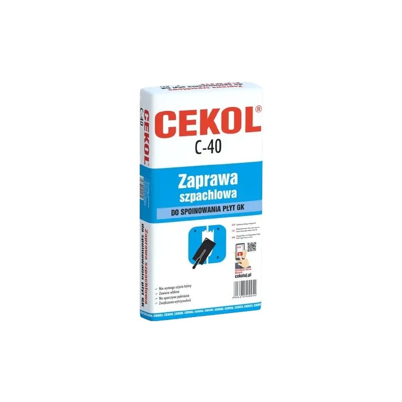 CEKOL C-40 jest suchą mieszanką wysokiej jakości gipsów, naturalnych wypełniaczy i środków modyfikujących. Zawiera włókna celulozowe i poliamidowe. Przeznaczony jest do spoinowania płyt gipsowo-kartonowych i gipsowych. CEKOL C-40 jest nietoksyczny w użyciu i podczas eksploatacji. Jest produktem łatwym w użyciu, o bardzo dobrych parametrach użytkowych. Dzięki zastosowaniu szerokiej gamy dodatków, CEKOL C-40 jest produktem o podwyższonej wytrzymałości i elastyczności, co pozwala w standardowych warunkach na rezygnację z użycia taśmy. CEKOL C-40 należy stosować wyłącznie wewnątrz budynków. Szlifowany, po całkowitym wyschnięciu, odpowiednio dobranym papierem ściernym lub siatką z poliwęglanu, daje idealnie gładką powierzchnię.