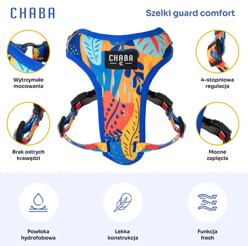 Chaba szelki Guard Comfort Story III bezuciskoweSzelki Guard Comfort Chaba – Seria Story: Wzory Lakota, Carnival, Aussie, JumboNadaj codziennym spacerom z psem nową jakość dzięki szelkom Guard Comfort z serii Story od Chaba. Wybieraj z czterech wzorów: Lakota, Carnival, Aussie, i Jumbo, które łączą w sobie najwyższy komfort użytkowania z ekscytującymi motywami estetycznymi.Charakterystyka szelek Guard Comfort: