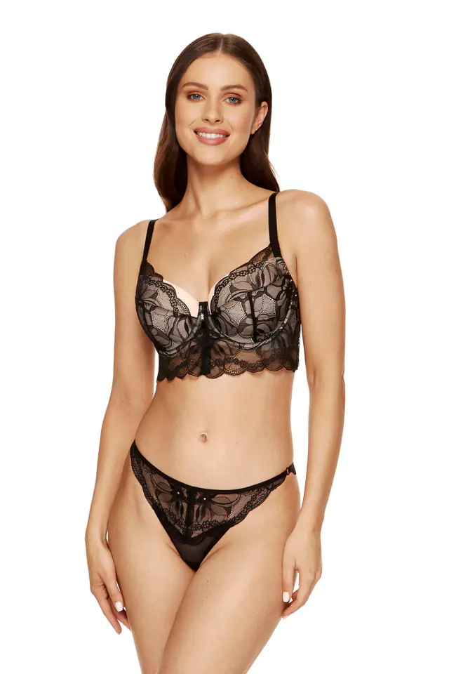 Piękny biustonosz usztywniany doskonale uwydatnia i podtrzymuje piersi. Miseczki pokryto elegancką, czarną koronką o kwiatowym wzorze.