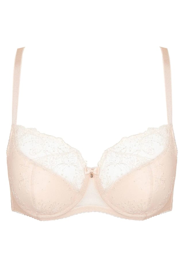 - Dolna część misek wykonana z cienkiej pianki gorseciarskiej powleczonej haftem, a górna z kwiatowego haftu, dzięki czemu biustonosz doskonale dopasowuje się do kształtu piersi,