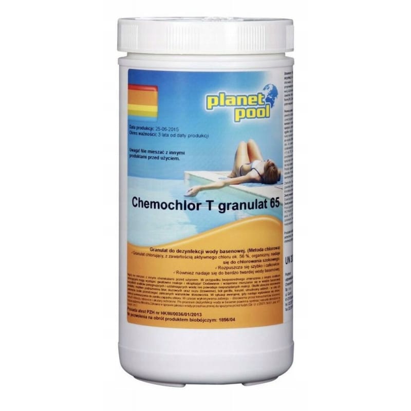 Produktów biobójczych należy używać z zachowaniem środków ostrożności.Przed każdym użyciem należy przeczytać etykietę i informacje dotyczące produktu. NAJWYŻSZEJ JAKOŚCICHEMIA BASENOWAPLANET POOL0501-001 1KGCHEMOCHLOR T GRANULAT 65CHLOR SZOKMOCNY CHLOR W GRANULACIESłuży do natychmiastowej (szokowej) dezynfekcji wody basenowej. Przed przystąpieniem do chlorowania szokowego powinieneś doprowadzić odczyn pH wody do optymalnej wartości 7,0-7,4 by produkt ten działał skutecznie.W przypadku innej wartości należy zastosować korektor pH czyli: pH plus lub pH minus. Chlorowanie szokowe wody najlepiej przeprowadzić wieczorem - wtedy gdy nie ma już promieniowania UV pochodzącego od słońca. Działanie szybkiego chloru jest wtedy skuteczniejsze gdyż nie ma redukcji spowodowanej działaniem promieni UV.Odpowiednią dawkę preparatu należy rozpuścić w wodzie i wlać bezpośrednio do basenu. Przestrzegamy przed wsypaniem granulatu do basenu - może to odbarwić wykładzinę w basenie. Chlorowanie szokowe można wykonywać regularnie nawet jeśli z wodą nie ma większych problemów. Będzie miało to wtedy charakter zapobiegawczy. Podniesienie dawki chloru raz na 2 tygodnie znacznie poprawi właściwości wody w basenie. Dezynfekcję należy przeprowadzać wieczorem. Wszelkie informacje oraz szczegółowy sposób użycia i dozowanie znajdziesz na opakowaniu.Chlor Szok Granulat to preparat do dezynfekcji i chlorowania szokowego wody basenowej. Produkt dzięki zawartości aktywnego chloru (56%) jest wysoce skuteczny. Chlorowanie szokowe to jedno z nieodzownych części pielęgnacji wody basenowej, pomaga usunąć groźne dla zdrowia bakterie, grzyby, drobnoustroje tak, aby korzystanie z kąpieli w basenie było nie tylko przyjemne, ale i zdrowe.Kolejną korzyścią wynikającą z chlorowania szokowego wody jest utrzymywanie efektu krystalicznie czystej wody. Duża ilość korzystających z kąpieli w basenie ludzi, bądź zmieniające się warunki atmosferyczne sprzyjają powstawaniu chloraminy, przez co woda może wydawać się lekko zielonkawa. Może również pojawiać się drażniący i nieprzyjemny zapach.Systematyczne chlorowanie szokowe wody pozwoli utrzymać higienę wody basenowej. Chlorowanie powinno przeprowadzać się przynajmniej raz w miesiącu lub częściej. Efekt chlorowania jest zauważalny natychmiastowo.Chlor Szok granulat równie dobrze sprawdza się w przypadku bardzo twardej wody. Przed chlorowaniem należy sprawdzić, czy pH wody basenowej jest odpowiednie, w razie potrzeby zastosować korektor pH. ZALETY STOSOWANIA CHEMOCHLOR T GRAN 65 1KG szybko rozpuszczalny bez pozostałości (osadu),dla wszystkich twardości wody,stabilizowany przeciw zbyt szybkiemu ubytkowi chloru pod wpływem ciepła i słońcaszybko i całkowicie rozpuszczalnypodnosi poziom chloru w wodziepostać granulatusilnie skoncentrowany (wysoka zawartość aktywnego chloru)działanie szokoweniszczy glony, pleśnie, bakterie, grzyby i wirusynatychmiastowa dezynfekcja po zastosowaniunie pozostawia osadówsilnie skoncentrowanyneutralny odczyn pHniepieniącyskuteczny dla wszystkich twardości wody,stabilizowany przeciw zbyt szybkiemu ubytkowi chloru pod wpływem ciepła i słońcanadaje się do wieloletniego przechowywaniaStały preparat chlorowy w formie granulek służy do szybkiej dezynfekcji wody basenowej ok 56% chloru. Wartośc pH neutralna, rozpuszcza się szybko i całkowicie, równiez nadaje sie do bardzo twardej wody basenowej.Działa biobójczo na szczepy: Pseudomonas aeruginosa i Staphylococcus aureu w stężeniu 100mg/L czas kontaku 60min. t. 20 stopni C. ZASTOSOWANIE baseny przydomowe bez automatycznej stacji dozującej,baseny z automatyczną stacją dozującą STOSOWANIE Przy pierwszym napełnianiu basenu ok. 80g/10 m3 wody. Do stałej dezynfekcji co 3-6 dni ok. 35g/10m3, do szokowego chlorowania 70-100g. Uzupełnianie powinno odbywać się wieczorem, po ustawieniu właściwej wartości pH (7,0 do 7,4).Wartość chloru wg. DPD powinna wynosić 0,5 mg.NIEBIESKA WODABASENCHEMIA DO BASENUKOD PRODUKTU: 20564