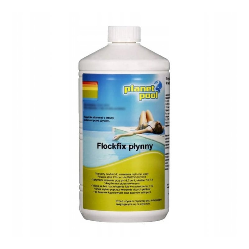 Produktów biobójczych należy używać z zachowaniem środków ostrożności.Przed każdym użyciem należy przeczytać etykietę i informacje dotyczące produktu. CHEMIA BASENOWAPLANET POOL0901-001SKGFLOCKFIX PŁYNNYKONCENTRATORDO BASENU NA MĘTNOŚĆ WODYOPAKOWANIE: 1 LFlockfix to płynny środek koagulacyjny z szerokim spektrum wartości pH. Jego działanie polega na minimalizowaniu zmętnień w wodzie.Flockfix ułatwia łączenie się zanieczyszczeń w duże płatki, które można łatwo usunąć z basenu.FLOCKFIX PŁYNNY - to środek koagulacyjny. Dzięki swojemu dopracowanemu składowi bardzo szybko łączą drobne zanieczyszczenia w większe płatki brudu, dzięki czemu pozostają one w naszym filtrze, a nie w basenie.Zastosowanie środka powoduje powstawanie z maleńkich zanieczyszczeń (pyłków) większych cząstek, które zatrzymywane są przez filtr lub opadają na dno i można je zebrać odkurzaczem podwodnym. Po dodaniu preparatu należy sprawdzać ciśnienie na manometrze i w razie potrzeby wykonać płukanie filtra. Działa najlepiej przy pH w przedziale 7,0-7,6. Szybko tworzy na lustrze wody płatki zanieczyszczeń, które łatwo odfiltrować. WŁAŚCIWOŚCI Służy do krystalizacji wody w baseniePostać płynuPoprawia wydajność złoża filtracyjnegoZapobiega i usuwa zmętnienie wodyNaturalny odczyn pHBardzo wydajnyBezwonnyBardzo ważną częścią utrzymywania wysokiej jakości wody w basenie jest koagulacja.Koagulacja jest procesem usprawniającym działanie filtrów. Za pomocą specjalnych preparatów możliwe jest skupienie drobnych cząstek zanieczyszczeń, dzięki czemu stają się one możliwe do usunięcia za pomocą filtra.W wodzie o temperaturze powyżej 20 st.C dochodzi do wzmożonego rozwoju bakterii i zarazków. Im temperatura wyższa, tym rozwój ten jest szybszy. Do zahamowania tego procesu stosuje się środki utleniające w postaci organicznych i nieorganicznych związków chloru (w postaci granulatu lub tabletek) lub preparatów na bazie aktywnego tlenu. Substancje te „spalają” drobnoustroje i dezynfekują w ten sposób wodę w niecce. Idealne stężenie wolnego chloru to 0,6 – 1,0 mg/l (Zawartość tlenu aktywnego powinna być większa od 5 mg/l). KOAGULACJA Niektóre cząsteczki zanieczyszczeń są tak małe, że filtr nie jest w stanie ich wyłapać. W celu ich usunięcia należy stosować środki powodujące skupianie się małych cząstek w większe. W wyniku takiego zabiegu zanieczyszczenia te pozostają na filtrze, a woda jest klarowna i czysta. ZALETY STOSOWANIA FLOCKFIX PŁYNNY Brak drobnych zanieczyszczeń , które wcześniej nie były filtrowane przez nasz filtr.Długa data ważności - bez problemu można ją przechowywać przez 3 lata (wg. producenta) z doświadczenia nawet do 10lat !!!Środek koagulacyjny FLOCKFIX PŁYNNY rozpuszcza się się bardzo szybko !Służy do stosowania we wszystkich basenach z filtrem piaskowym!Optymalne działanie przy pH 4,5 do 9, idealne 7,0-7,4Używa się bez rozcieńczenia lub w rozcieńczeniu 1:10Do basenów kąpielowych oraz basenów whirlpoolPOSIADA ATEST PZH NR HK/W/0099/08/2006Pozwala na uzyskanie krystalicznie czystej wody!!!! STOSOWANIE PREPARATU Produkt w płynie podaje się za pomocą pompy dozującej z opakowania dostawczego bezpośrednio do wody surowej, przy czym dysza dozująca musi być tak zabudowana, aby miejsce wtrysku znajdowało się w środku instalacji rurowej, aby osiągnąć gwarantowane wymieszanie. Miejsce wtrysku powinno znajdować się możliwie tuż przed pompą obiegową lub tuż za nią, aby wykorzystać drogę i czas reakcji. Ilość dozowana zależy od obciążenia zbiornika i czasu obiegu.To znaczy, że krótki czas obiegu i małe obciążenie osobami kąpiącymi się wymagają małego dozowania, a długi czas obiegu i duże obciążenie kąpiącymi większego dozowania. Ilość zużywanego środka, w odniesieniu do koncentracji dostawczej, wynoszą 0,5 do 1,3 a w szczytowych obciążeniach również 2g na 1m3 wody.NIEBIESKA WODABASENCHEMIA DO BASENUKOD PRODUKTU : 20673