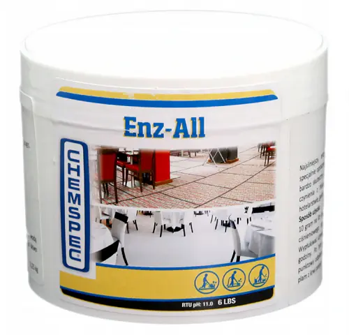 Chemspec Enz-All - to najsilniejszy enzymatyczny pre-spray na rynku zawierający enzymy proteolityczne specjalnie opracowane do usuwania najtrudniejszych zabrudzeń białkowych. Okazał się również niezwykle skuteczny w usuwaniu moczu i kału, krwi, trawy. Skutecznie usuwa tłuszcze, oleje jadalne i zabrudzenia, które można zwykle spotkać w hotelarstwie, gastronomii, opiece zdrowotnej i domu.