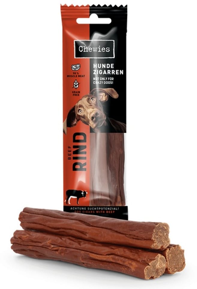 Cygara Chewies to chwila przyjemności dla psów - oczywiście bez dymu!Czy Twój czworonożny przyjaciel jest wobec Ciebie bardzo przebiegły? Bystre psy wiedzą, że najsłodszy wygląd (z małą główką przechyloną na bok!) lub wykonanie wszystkich sztuczek, których się nauczył, jest skuteczne aby dostać smaczny kąsek. Trudno się oprzeć takim działaniom, prawda? Dlatego tym ważniejsze jest oferowanie przekąsek przyjaznych psom. Gwarantujemy, że cygara dla psów Chewies są wolne od dymu i zapewniają prawdziwe chwile przyjemności.Nasze cygara dla psów w środku są pełne intensywnego mięsnego smaku. Wysoka zawartość mięsa wynosząca od 94% rozpieszcza najbardziej wymagających futrzanych przyjaciół najlepszym mięsem mięśniowym. Wiele odmian smakowych (np. wołowina, królik, kangur i jeleń) czeka na Twojego konesera. Cygara dla psów zachwycają nie tylko smakiem, ale także wysoką zawartością białka. Są również bezzbożowe, nie zawierają cukru ani innych dodatków. W ten sposób lubimy rozpieszczać naszych czworonożnych przyjaciół.W recepturze cygar zawarte są również superfoods, które zapewniają dodatkowy zastrzyk składników odżywczych. Konopie są bogate w błonnik i naturalne źródło aminokwasów, magnezu, żelaza i cynku. Prawdziwa bomba odżywcza! Maliny i porzeczki to także prawdziwy zastrzyk witamin dla Twojego czworonożnego przyjaciela.Cygara dla psów Chewie's to idealna przekąska dla prawdziwych koneserów. A co najlepsze: są dozwolone nie tylko od 18 roku życia, ale także dla szczeniąt! Ze względu na przyjemną konsystencję lubią je również starsze pyszczki.Każdy, kto chce cieszyć się życiem, podjada!Skład: Mięso wołowe 98%, jelita kolagenowe 2%Analiza:Białko surowe 63,8%, zawartość tłuszczu 21%, popiół surowy 4,3%, włókno surowe 2,5%