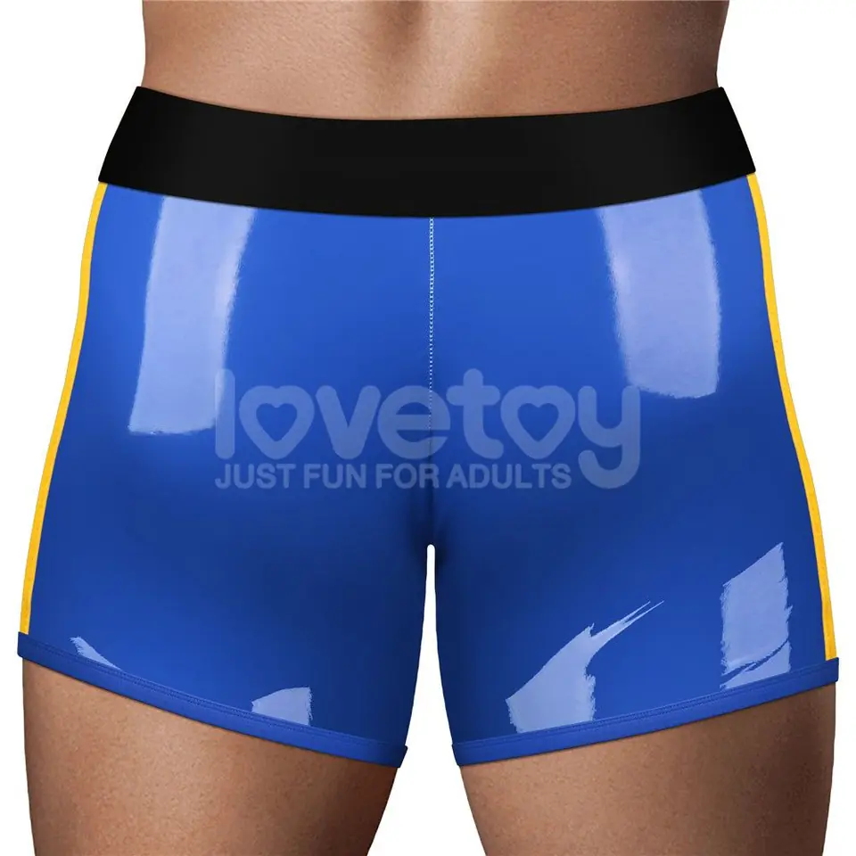 Chic Strap-On Shorts marki Lovetoy to uniwersalne bokserki typu strap-on, idealne zarówno dla mężczyzn, jak i kobiet. Wykonane z wysokiej jakości materiałów, zapewniają komfort i wygodę podczas noszenia. Bokserki są dostępne w rozmiarze odpowiadającym 28-31 cali w pasie i charakteryzują się stylowym niebieskim kolorem z żółtymi paskami. Dzięki specjalnemu designowi umożliwiają dyskretne noszenie i łatwe przechowywanie strap-onów.