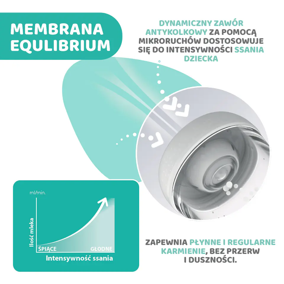 Podczas ssania aktywowana jest MEMBRANA EQUILIBRIUM u podstawy butelki, która uwalnia przepływ powietrza, zapobiegając powstawaniu podciśnienia w jej wnętrzu. Dostęp powietrza od podstawy butelki sprawia, że nie miesza się ono z mlekiem i nie jest połykane przez dziecko. Elastyczność dynamicznego zaworu antykolkowego pozwala za pomocą mikroruchów reagować na potrzeby dziecka - w zależności od intensywności ssania, na bieżąco dostosowuje się przepływ powietrza, zapewniając płynne i regularne karmienie, bez przerw i duszności.