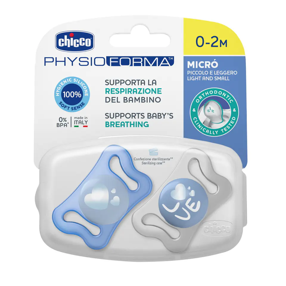 Chicco Physio Micro dostępny jest w gamie 6 dekorów, w odcienach różu i niebieskiego, pakowany podwójnie.Wszystkie smoczki Chicco Physio Micro posiadają identyczną końcówkę do ssania, ergonomiczny kształt tarczki oraz wykonane są z najwyższej jakości materiałów.