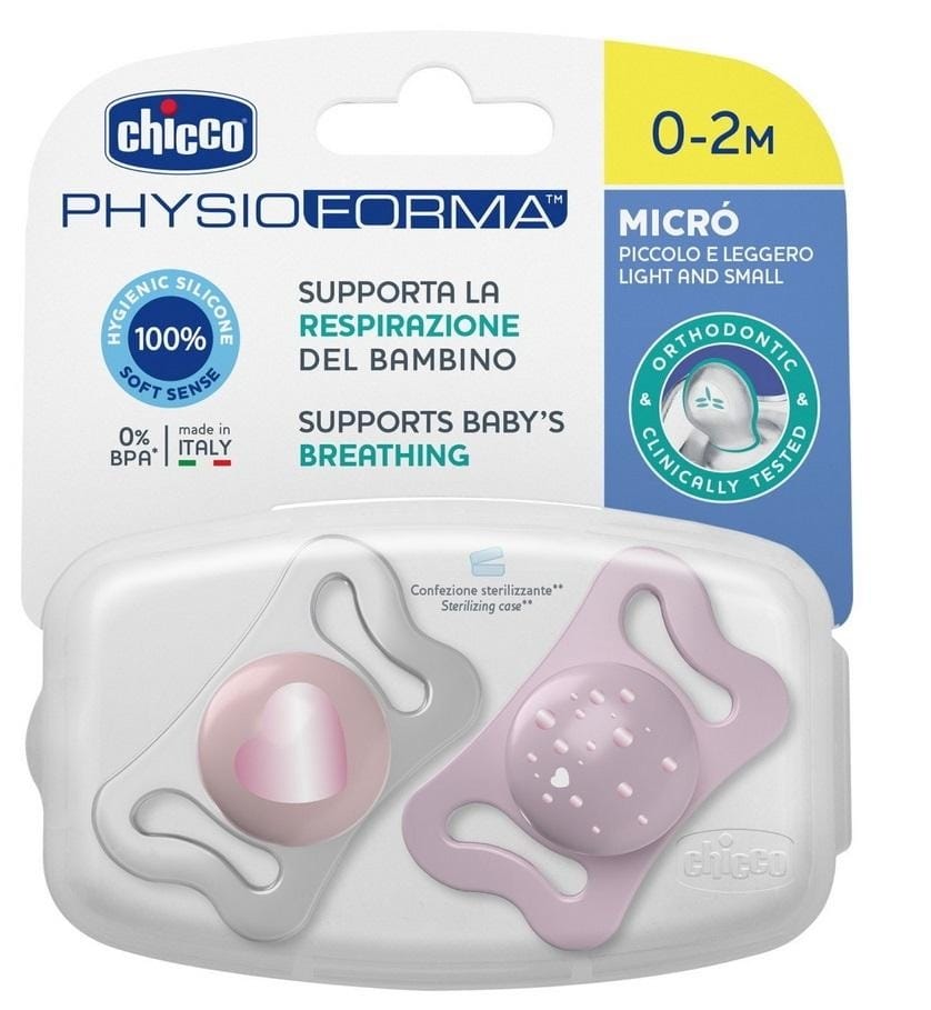 Chicco Physio Micro dostępny jest w gamie 6 dekorów, w odcienach różu i niebieskiego, pakowany podwójnie.Wszystkie smoczki Chicco Physio Micro posiadają identyczną końcówkę do ssania, ergonomiczny kształt tarczki oraz wykonane są z najwyższej jakości materiałów.