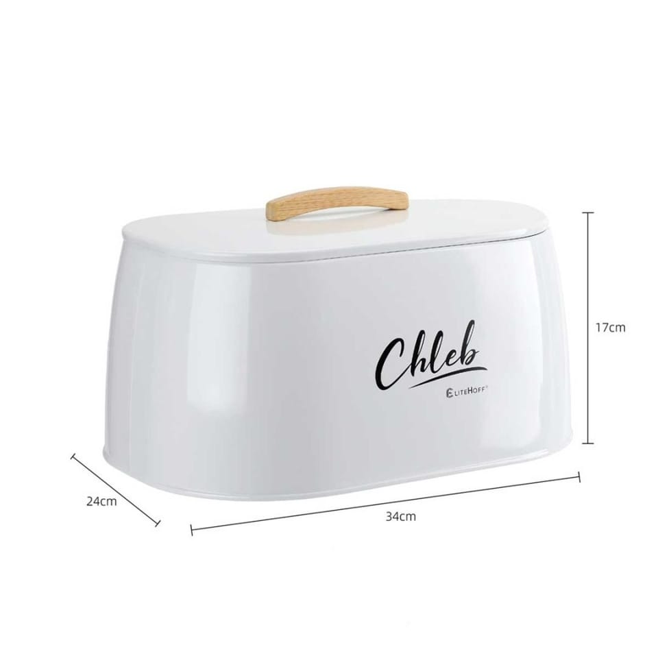 Nowoczesny chlebak marki ELITEHOFF wykonany z wytrzymałego metalu i wyposażony w pokrywę z drewnianym uchwytem, nie tylko pomaga w przechowywaniu pieczywa, ale również stanowi atrakcyjny element wystroju.