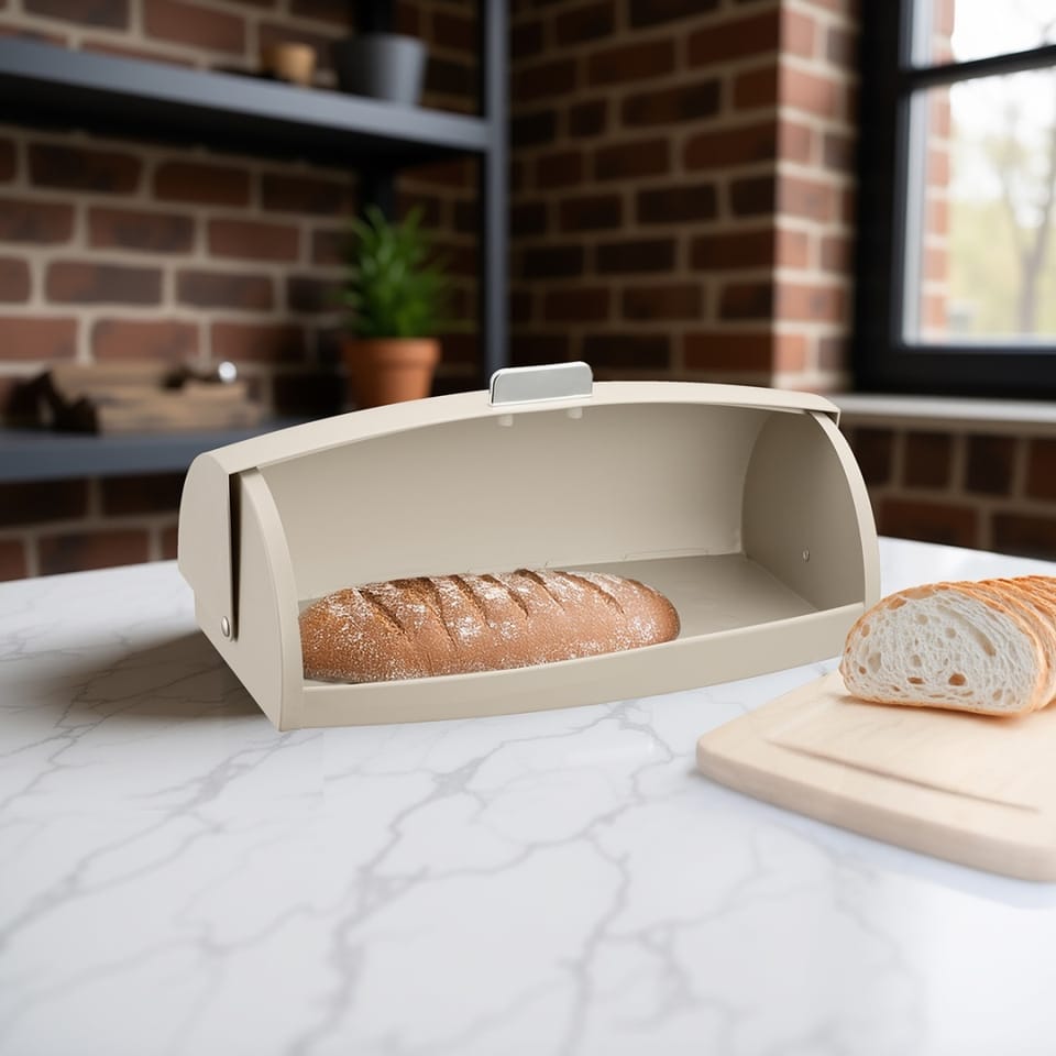 Beżowy chlebak marki KLAUSBERG to eleganckie i funkcjonalne rozwiązanie do przechowywania pieczywa. Korpus wykonany z metalu zapewnia trwałość, natomiast lekko zaokrąglona klapa została wykonana z polistyrenu (PS) – tworzywa odpornego na zarysowania, lekkiego i higienicznego. Całość zamknięta w subtelnej, kremowej tonacji sprawia, że chlebak idealnie wpasuje się w jasne i przytulne kuchenne aranżacje.