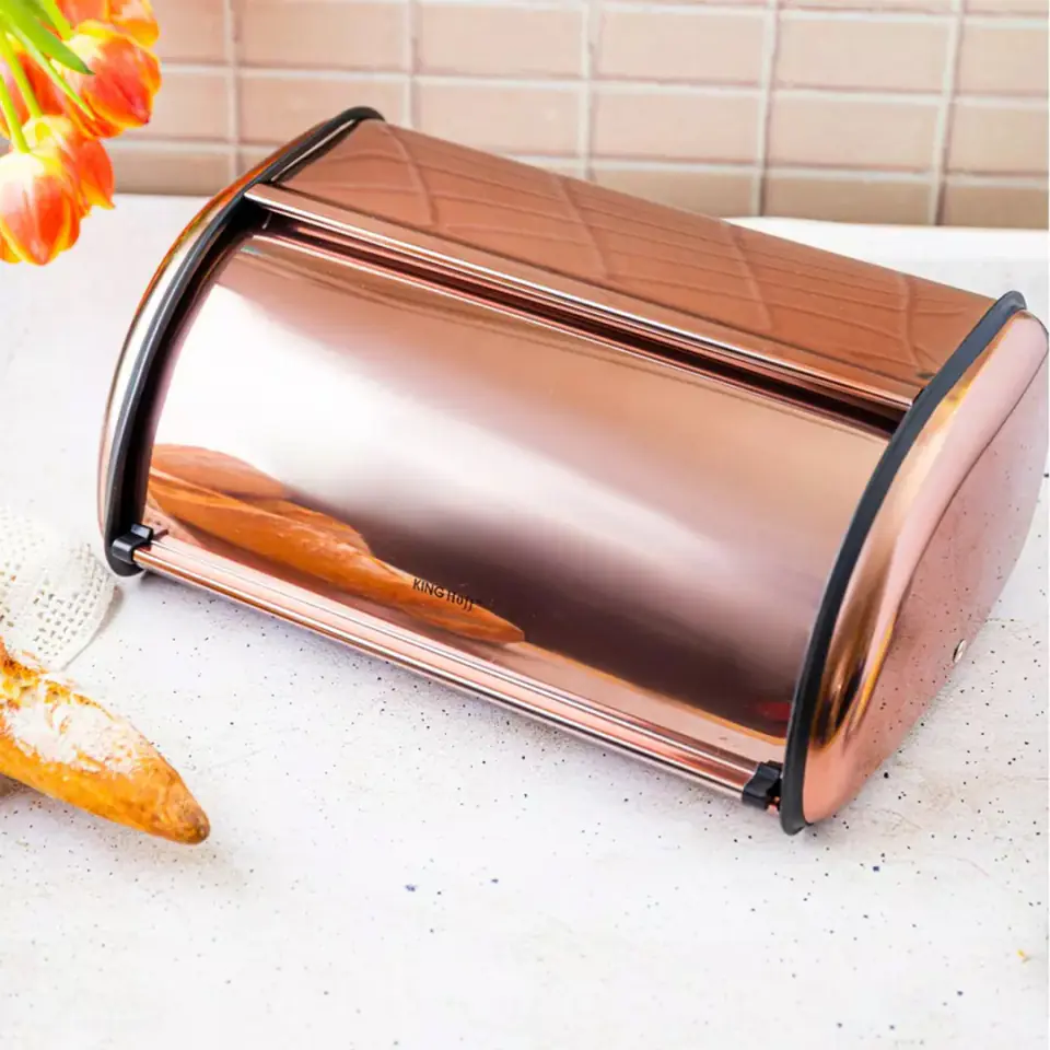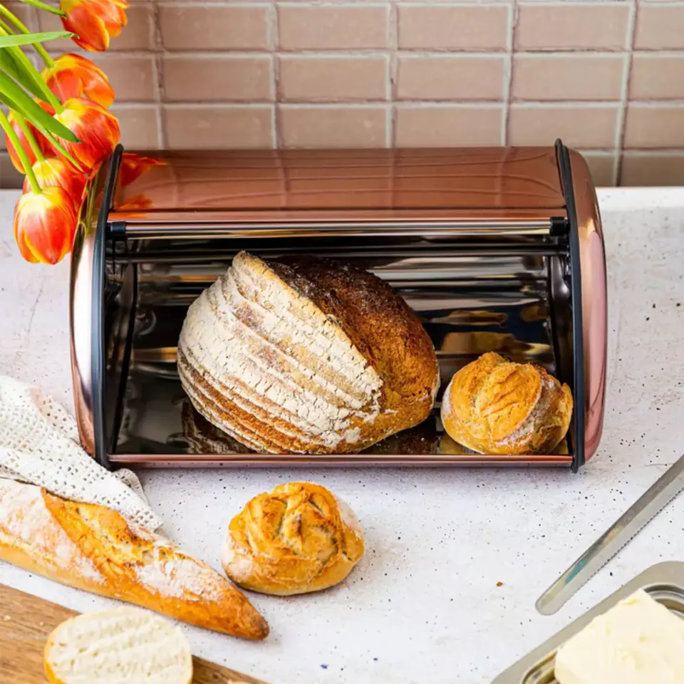 Duży pojemnik na pieczywo typu roll top wykonany z lakierowanej stali nierdzewnej w kolorze różowego złota.
