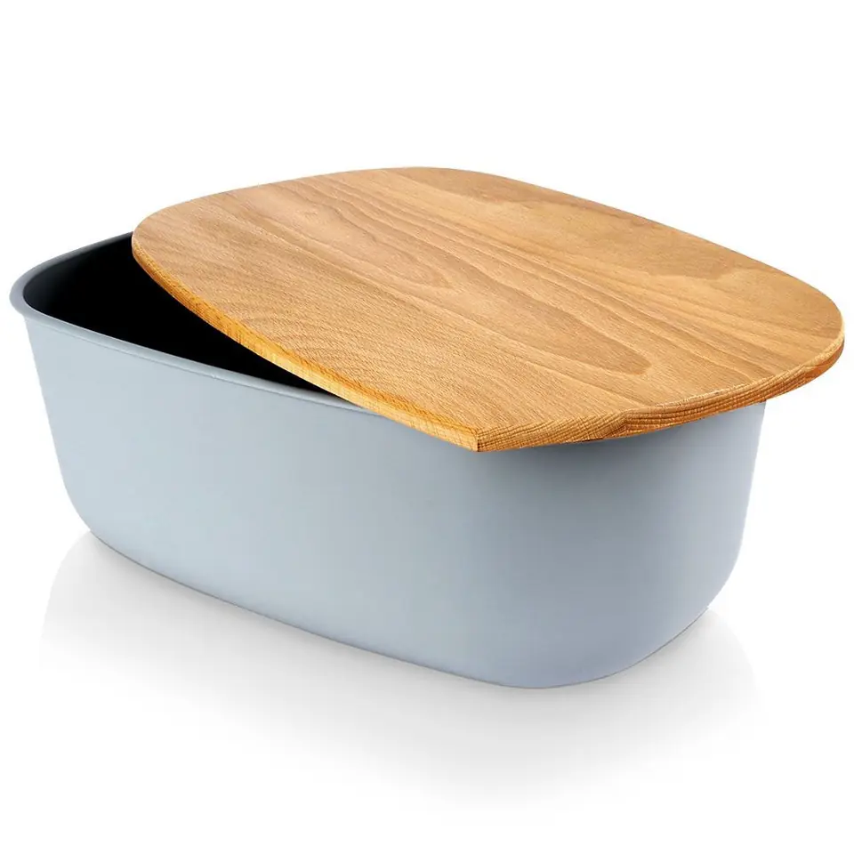 Pojemny chlebak wykonany z wysokiej jakości tworzywa w szarym kolorze. Posiada pokrywę w formie drewnianej deski, którą wykorzystamy do krojenia pieczywa.