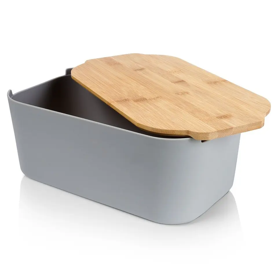 - STYLOWY - Chlebak wykonany z wysokiej jakości tworzywa w kolorze szarym z bambusową deską. Chlebak ma wymiary zewnętrzne: 33 x 18,5 x 12 cm.