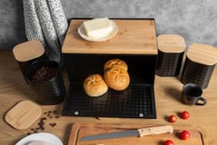 Chlebak stalowy z deską bambusową oraz zestawem pojemników kuchennych i nożem