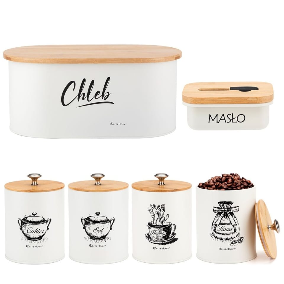 Pojemniki kuchenne zostały zaprojektowane tak, aby spełniać wszystkie potrzeby Twojej kuchni. Są odporne na uszkodzenia mechaniczne oraz łatwe do utrzymania w czystości. Wykonane z metalu malowanego proszkowo na kolor biały. Pokrywy wykonane z drewna bambusowego. W pokrywie maselniczki nożyk do smarowania umieszczony w wyprofilowanym zagłębieniu.