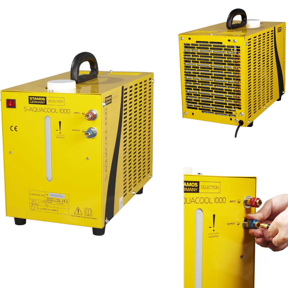 Nazwa producenta: S-AQUACOOL 1000Spawanie prądem powyżej 150 A, zwłaszcza w dłuższych cyklach pracy, wymaga odpowiedniego chłodzenia uchwytu. Wiele spawarek, mimo iż wyposażone są w odpowiednie przyłącze, nie ma w zestawie odpowiedniej chłodnicy, przez co użytkownik nie może wykorzystać całego potencjału urządzenia. Chłodnica wodna niemieckiej marki Stamos Selection nie tylko pozwala osiągnąć pełną wydajność spawarki, ale także przedłuża jej żywotność. Sprawny obieg wody i skuteczne odprowadzanie ciepła z uchwytu zostało osiągnięte poprzez wykorzystanie w urządzeniu wydajnej pompy, wentylatora, miedzianej wężownicy i aluminiowego radiatora.Cechy i funkcje: