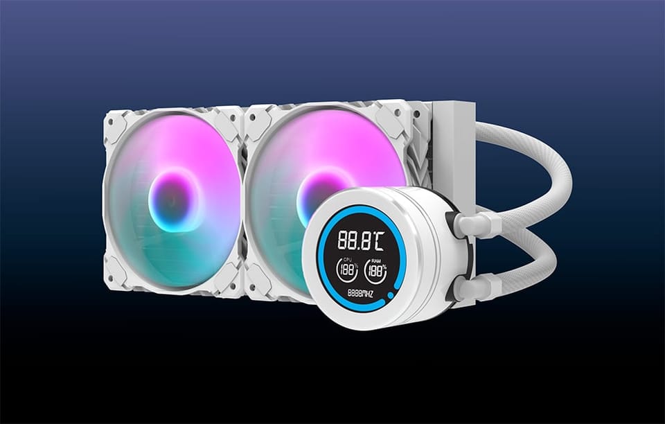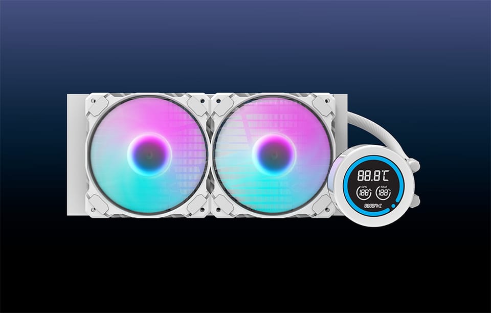 Darkflash DN-D240 to wydajne chłodzenie wodne 240 mm, które zapewnia stabilną pracę procesora przy niskich temperaturach. Wyposażono je w miedziany blok wodny oraz aluminiowy radiator, dzięki czemu efektywnie odprowadza ciepło, co jest niezbędne przy intensywnym obciążeniu systemu. Podwójne wentylatory 120 mm z łożyskami hydraulicznymi, regulacją PWM i podświetleniem ARGB gwarantują optymalny przepływ powietrza oraz cichą pracę. Wyświetlacz LCD umożliwia monitorowanie temperatur CPU i RAM, a rurki IIR+EPDM zapewniają odporność na wysokie temperatury i trwałość konstrukcji.