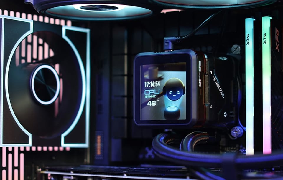 Zintegrowany z blokiem wodnym 2,88-calowy ekran IPS (480×480 px) pozwala na bieżące śledzenie temperatury CPU, obrotów wentylatorów, godzin czy trybów pracy. Dzięki magnetycznemu mocowaniu można go odłączyć i zamontować w innym miejscu – np. na froncie obudowy. Wyświetlane informacje są dostosowywane przez autorskie oprogramowanie, które obsługuje motywy, synchronizację między urządzeniami i wizualizacje AR.
