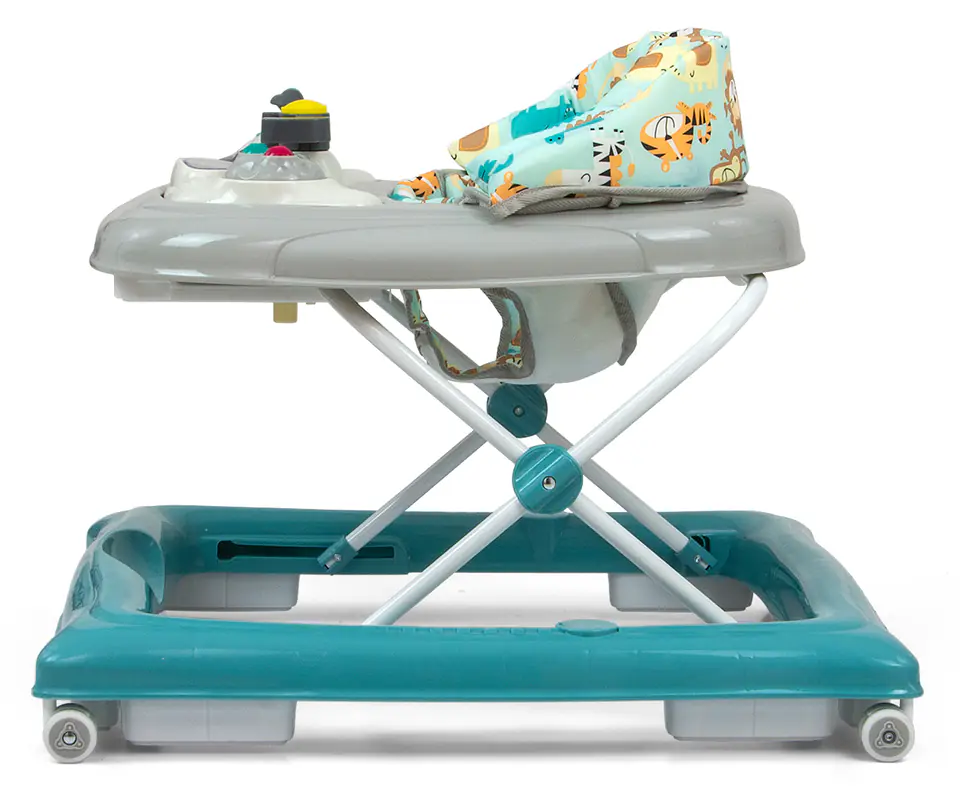 Produkt posiada edukacyjny panel, który zawiera szereg niespodzianek czekających na małych odkrywców: światełka, piszczałki, melodyjki, grzechotka, przyciski i inne ruchome elementy. Po wypięciu panelu z tacki chodzika posłuży on jako niezależna zabawka, np. jako umilacz w podróży, a blat przyda się jako stolik do zabaw.